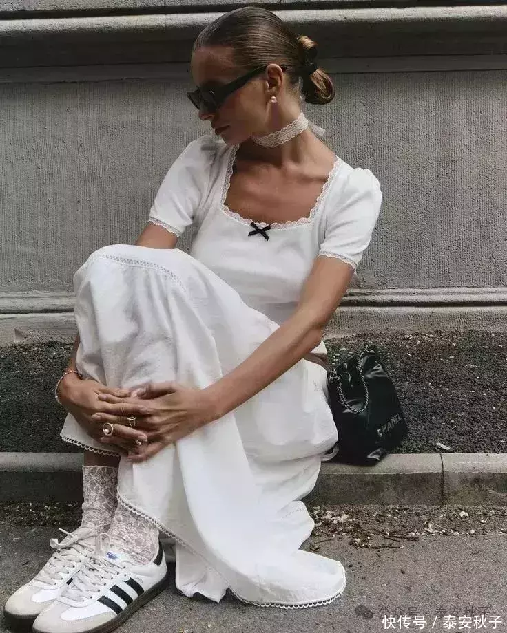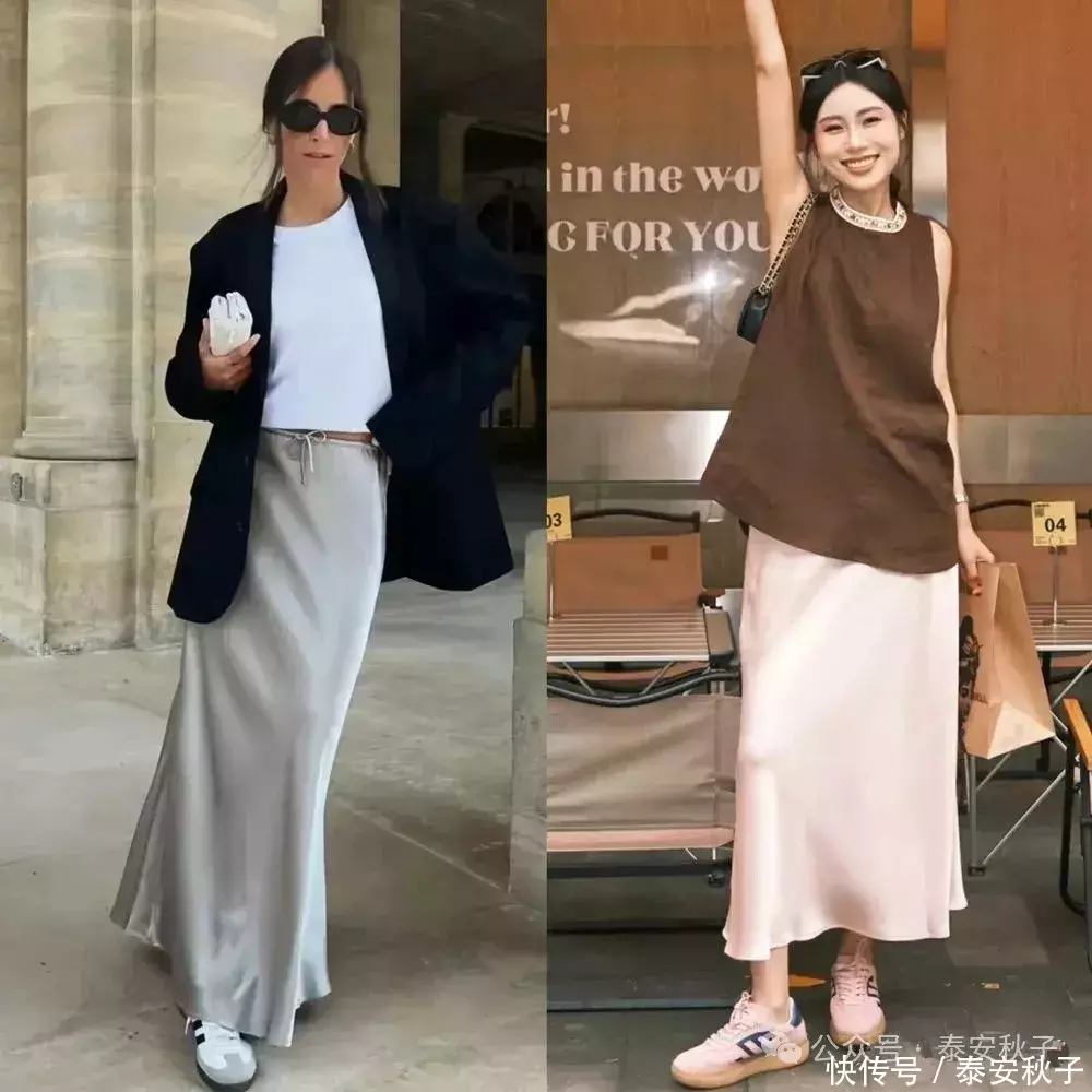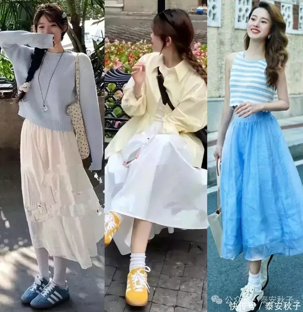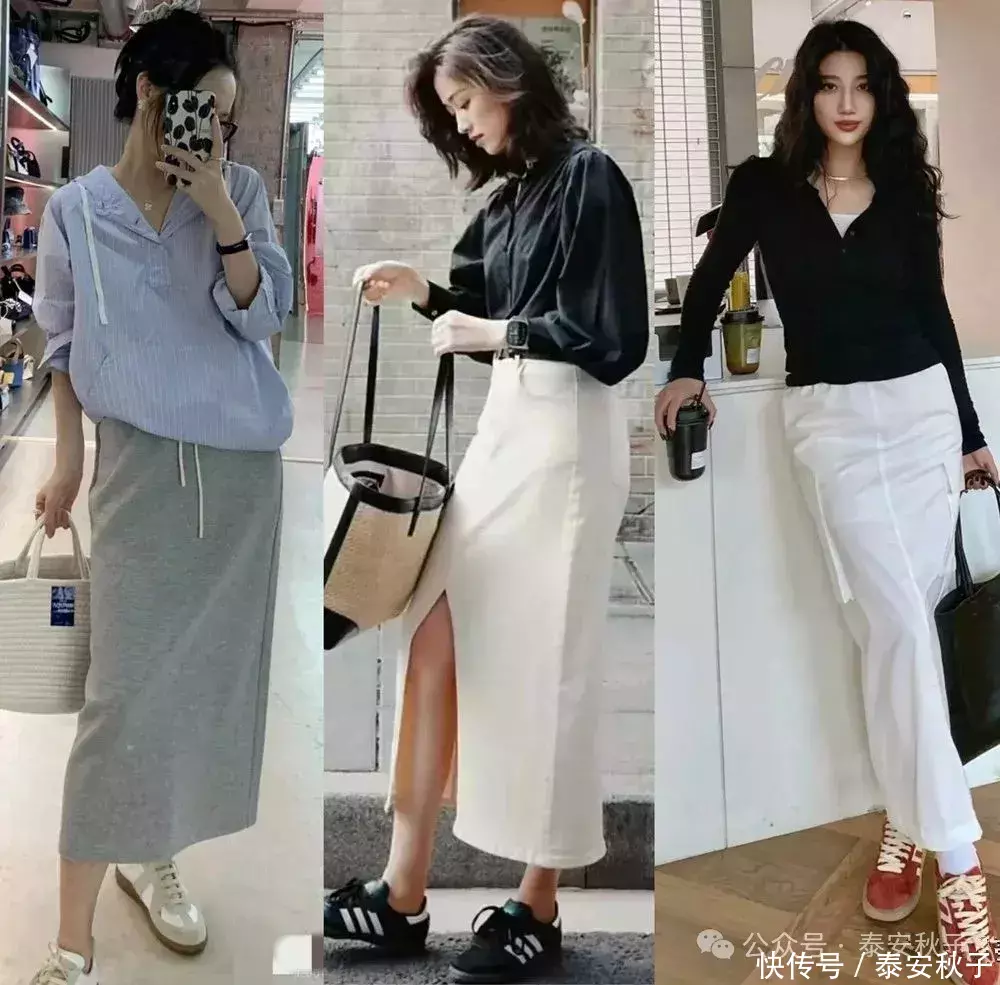 立秋后,天高气爽,我们可以试试优雅半身裙与休闲德训鞋的穿搭,能轻易地营造出帅气时髦的腔调。