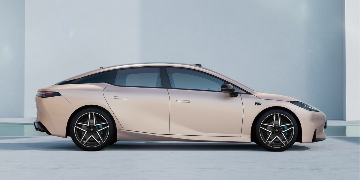 车身侧面,流畅的腰线从车头一直延伸至车尾,勾勒出极具力量感的车身轮廓。整体造型低趴流畅,风阻系数低至 0.197Cd。不仅带来了出色的空气动力学性能,更营造出强烈的运动氛围。